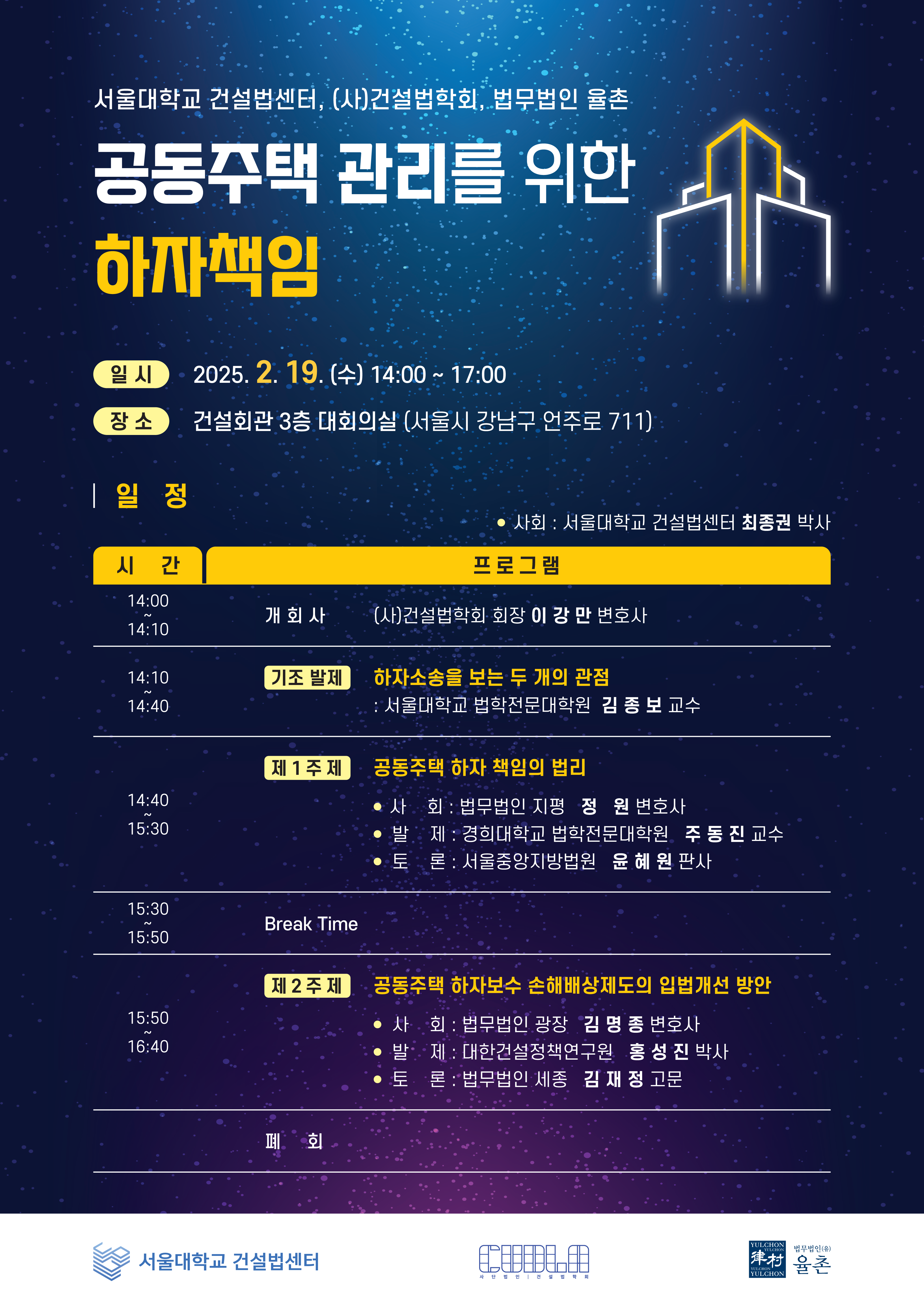 □「공동주택 관리를 위한 하자책임」세미나 개최 개요 가. 일 시 : 2025.2.19(수) 14:00~17:00 나. 장 소 : 건설회관 3층 대회의실(서울시 강남구 언주로 711) 다. 주 최 : 서울대학교 건설법센터, (사)건설법학회, 법무법인 율촌 라. 주제발표 ① 기조발제 : 하자소송을 보는 두 개의 관점 ② 제1주제 : 공동주택 하자 책임의 법리 - (사 회) 정 원 변호사(법무법인 지평) - (발 제) 주동진 교수(경희대학교 법학전문대학원) - (토 론) 윤혜원 판사(서울중앙지방법원) ③ 제2주제 : 공동주택 하자보수 손해배상제도의 입법개선 방안 - (사 회) 김명종 변호사(법무법인 광장) - (발 제) 홍성진 박사(대한건설정책연구원) - (토 론) 김재정 위원(법무법인 세종)